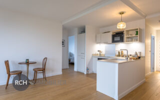 entrée, séjour, salle à manger, cuisine équipée, deux chambres, dressing, salle de douches et WC indépendants.